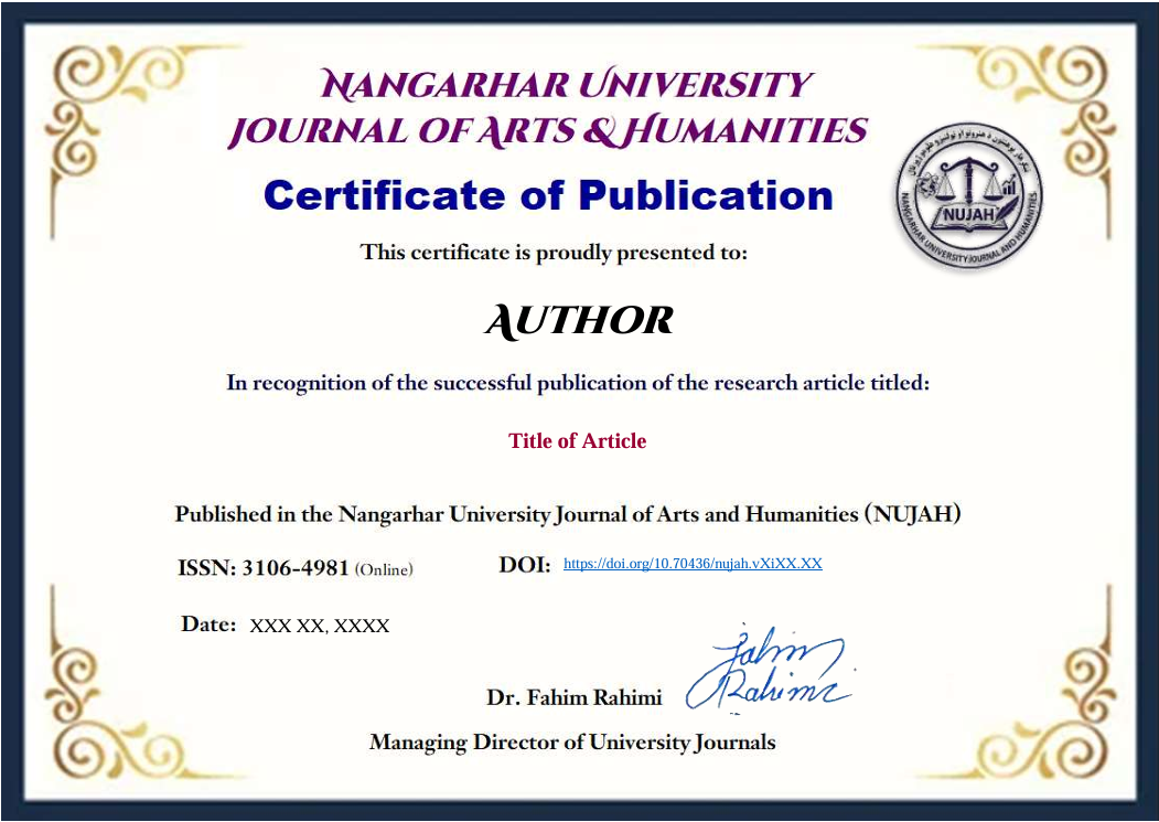 Nangarhar University Journal of Arts and Humanities (NUJAH) ISSN: 3106-4981 (Online) is an international, quarterly, open-access, peer-reviewed journal published by Nangarhar University. The journal invites original research articles, review papers, technical reports, and short communications offering new insights across the Arts and Humanities fields, including, Literature, Language and Linguistics, Communication, Media. NUJAH aims to foster academic dialogue and interdisciplinary research by publishing high-quality, scholarly work that deepens the understanding of human culture, society, and thought. All submissions are rigorously peer-reviewed to ensure academic excellence, originality, and relevance.